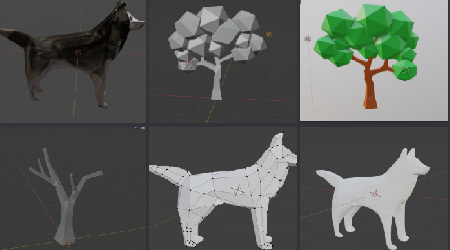 3D modelling work in Blender, featuring various stages of the modelling process, including creating topology, UV wrapping and texturing